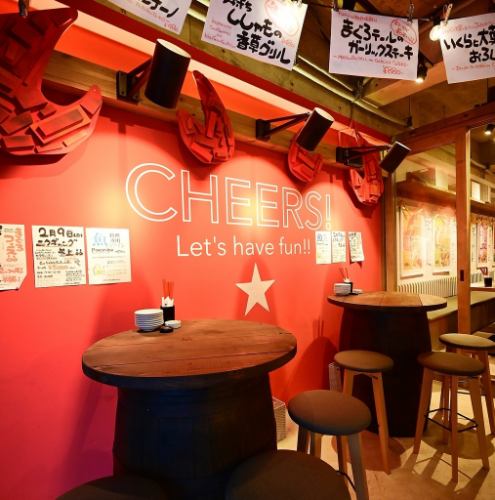 高桌座位非常適合休閒聚會。鮮豔的紅色牆壁一定會讓你興奮不已!這是和朋友一起玩樂的好地方。一邊享用新鮮的時令海鮮和美酒,一邊暢談! *禁煙席